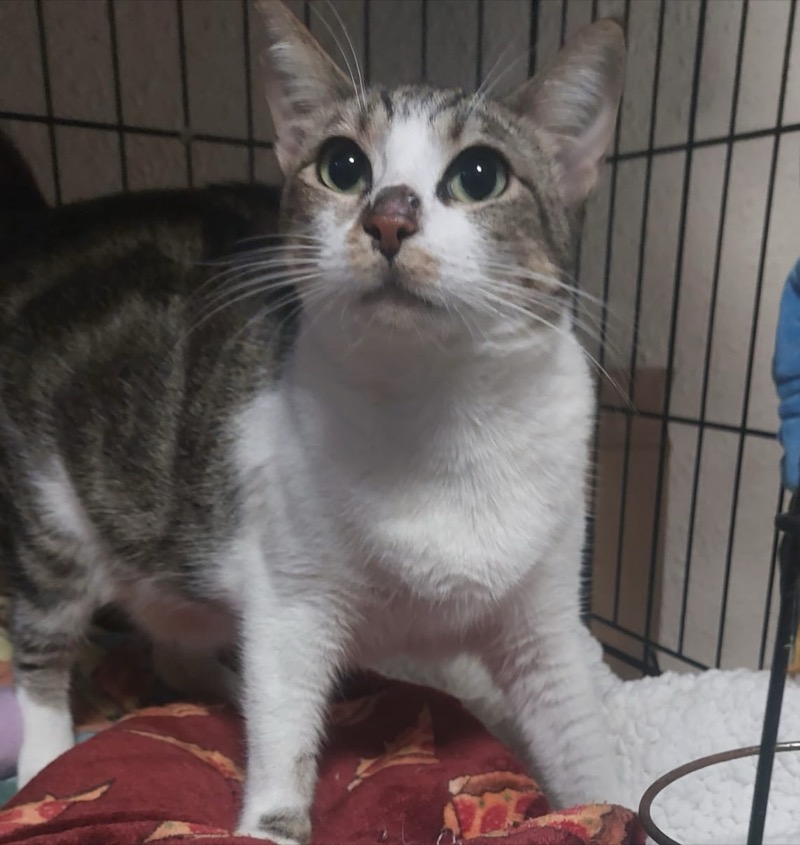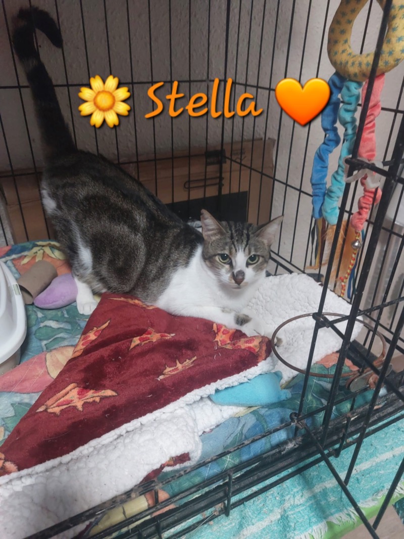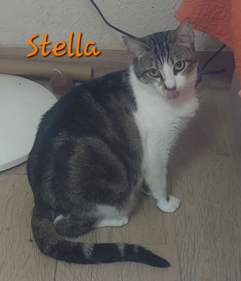 Stella quedó atrapada cuando era una joven gatita de una de nuestras colonias en Carrer Cardenal Benlloch en L'Eliana en mayo de 2022. A pesar de ser acogida con un manejo regular durante unos meses y ser esterilizada, Stella permaneció infeliz y ella y sus hermanas fueron devueltas a su colonia para permanecer bajo el cuidado de nuestros voluntarios. En el último año se ha vuelto muy cariñosa con uno de nuestros voluntarias que la recogió de nuevo en agosto de 2023 cuando se dio cuenta de que estaba herida después de una sospecha de pelea de gatos. A Stella ahora le encanta estar con la gente y hace "pan" con sus patas delanteras cuando está muy feliz.
