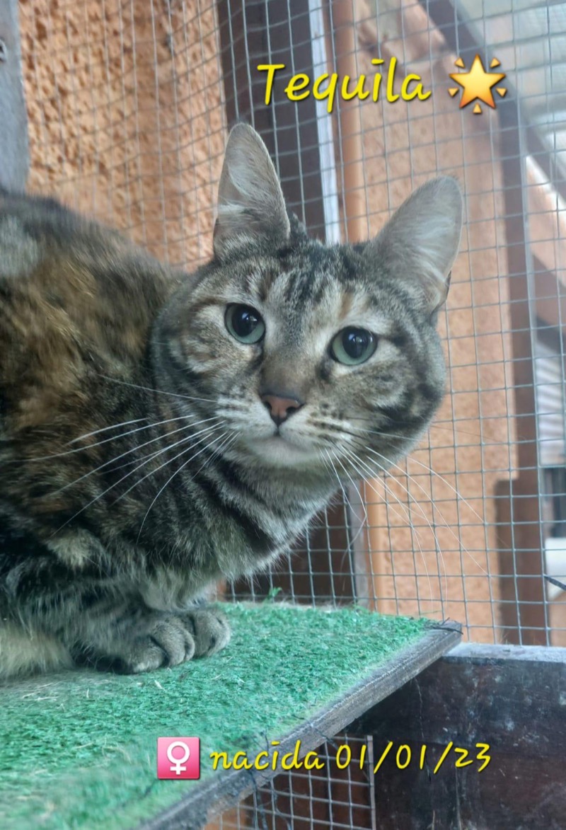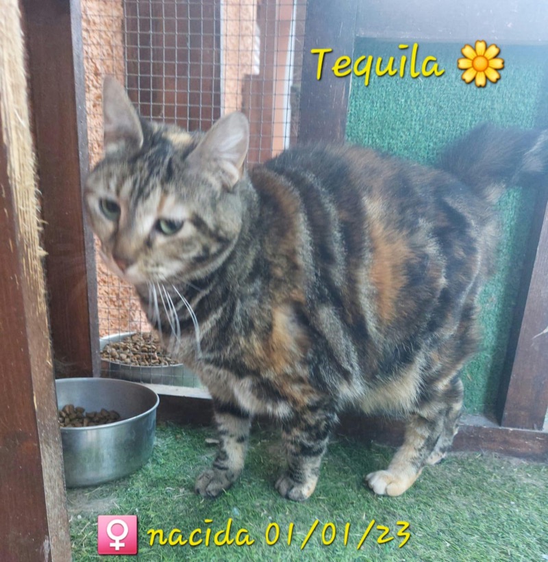 "Tequila, she makes me happy." Fue rescatada como una gatita de una colonia de gatos en L'Eliana, regresó a la colonia después de la esterilización y fue retirada de nuevo como adulta joven después de una lesión. Ella es una gata tan dulce y amigable que su cuidador de acogida quería ofrecer la posibilidad de una vida diferente fuera de las calles, en un hogar propio. Tequila tiene una cola corta y retorcida.